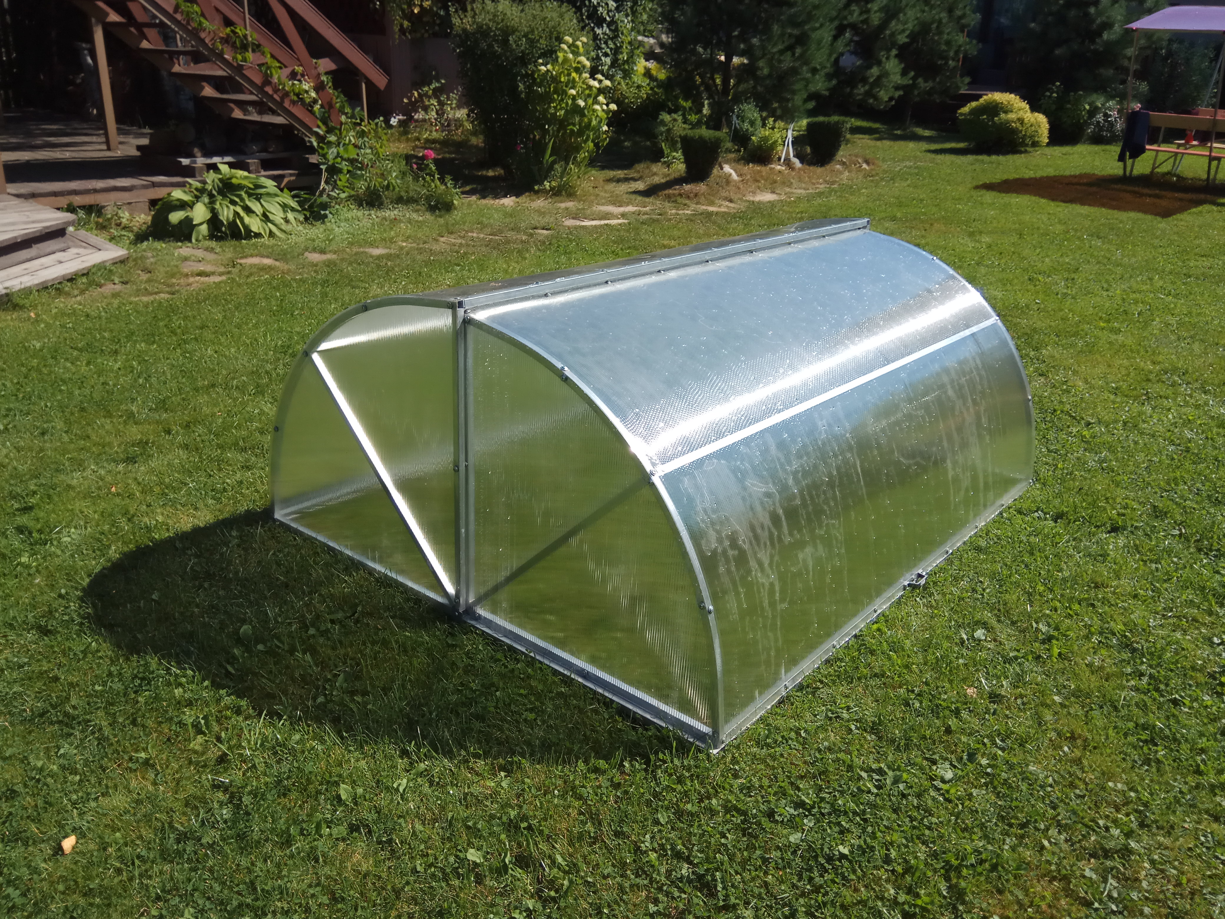 Главное отличие, давшее этому типу теплиц название – своеобразная крыша, которая для проветривания открывается аналогично одноимённой кухонной утвари. Конструкция состоит из основания, арочной крыши, глухих торцевых стенок. Крыша, в зависимости от размера теплицы, может открываться одним из трёх способов: