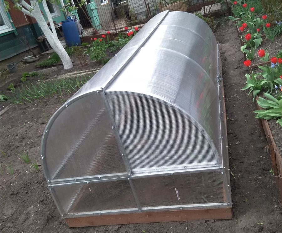 Второй важной особенностью такого парничка считается небольшой размер. Для обслуживания грядок не нужно входить внутрь, для этого достаточно открыть крышу с нужной стороны. Более удобны «хлебницы», у которых открываются обе половинки крыши, но встречаются одностворчатые – «улитки» и «ракушки». Если обе половинки крыши можно одновременно поднять на опорах, то это уже будет «бабочка».