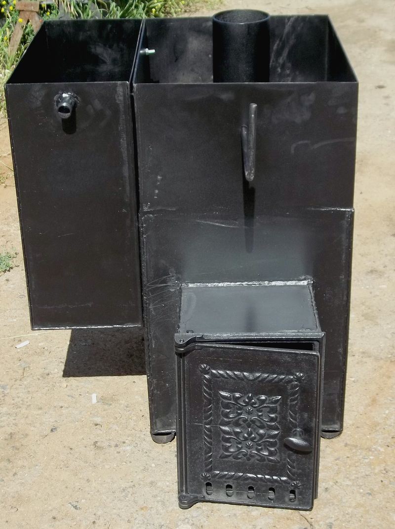 Топочные двери в ассортименте: металлическая, чугунная, стекло+чугун. Баки из нержавейки 1,5-2 мм., в каждой печи свой литраж.